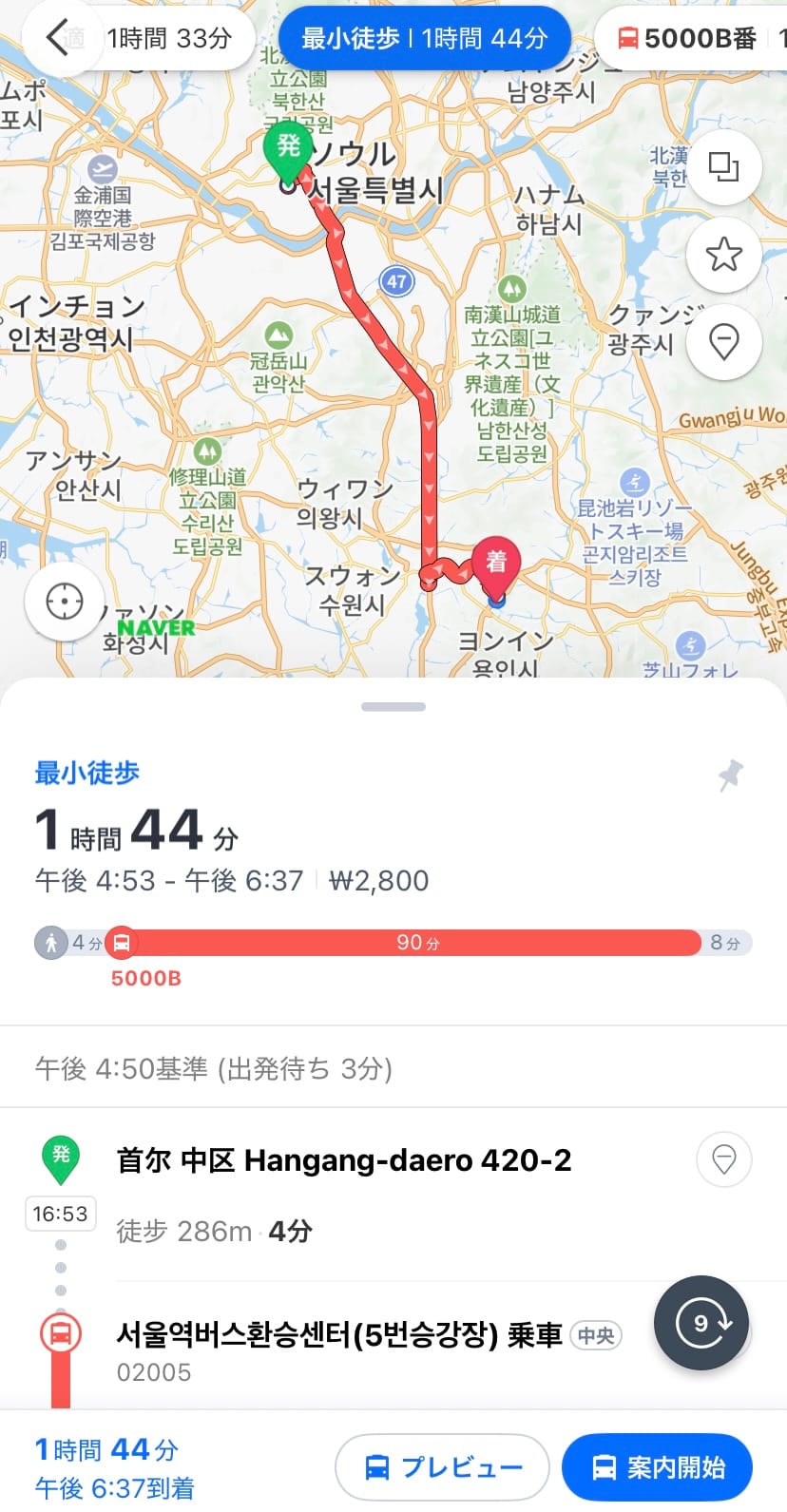 例としてソウル駅からキックオフ1時間前到着を目安としたアクセスを調べますと、まずバス「5005」系統に1時間少々乗って「サムガ洞」で下車。