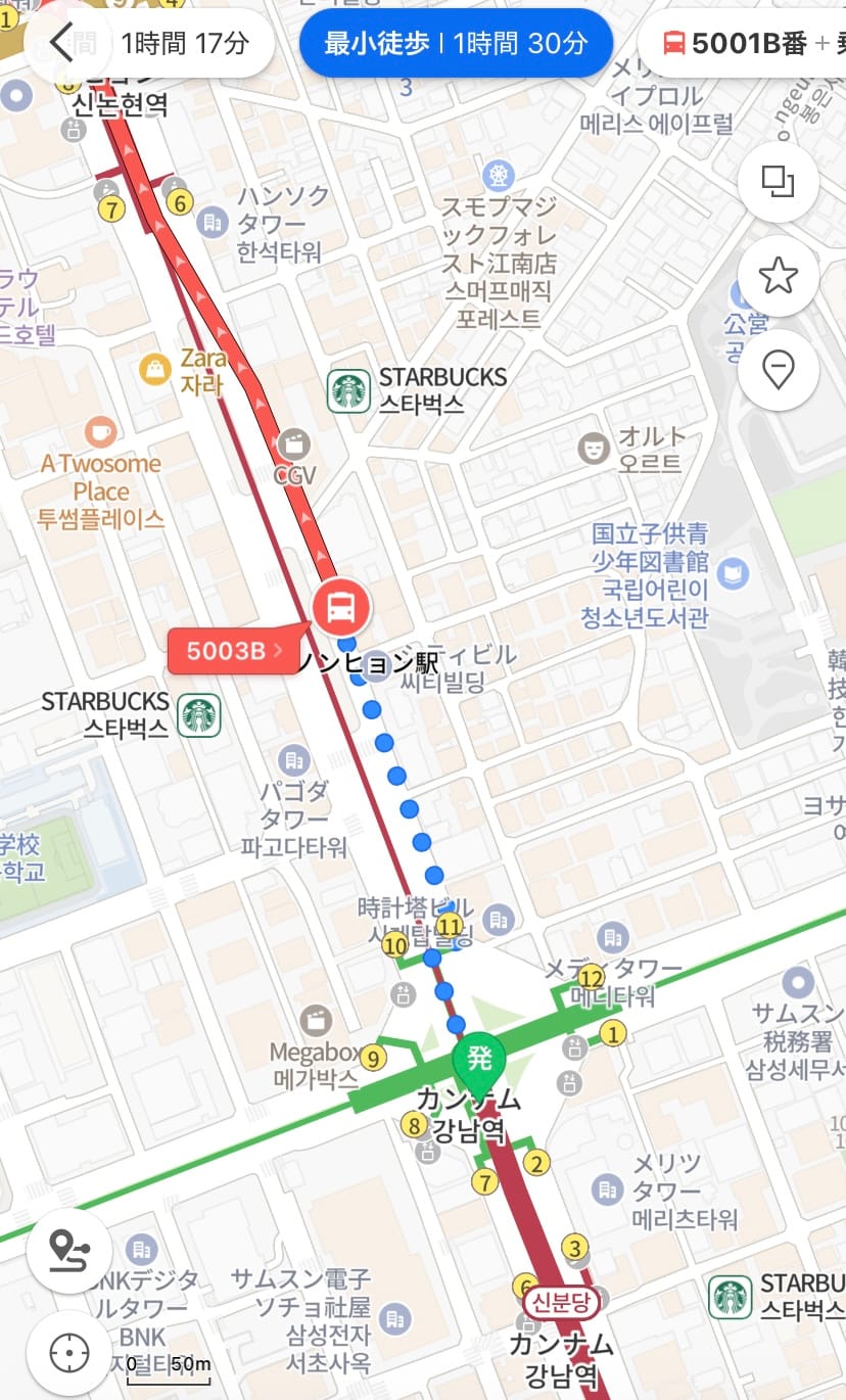 続いて、2つ目の例として繁華街である江南(カンナム)からのアクセスも見ていきましょう。