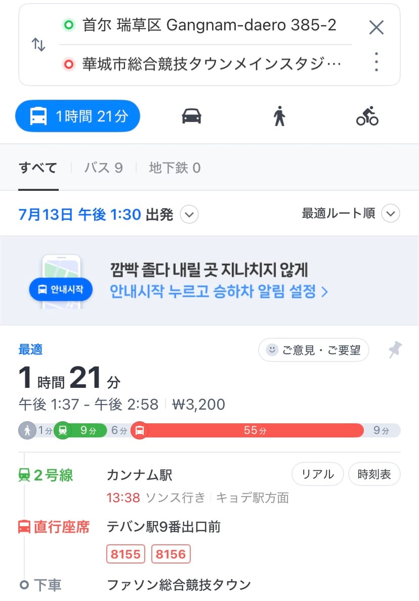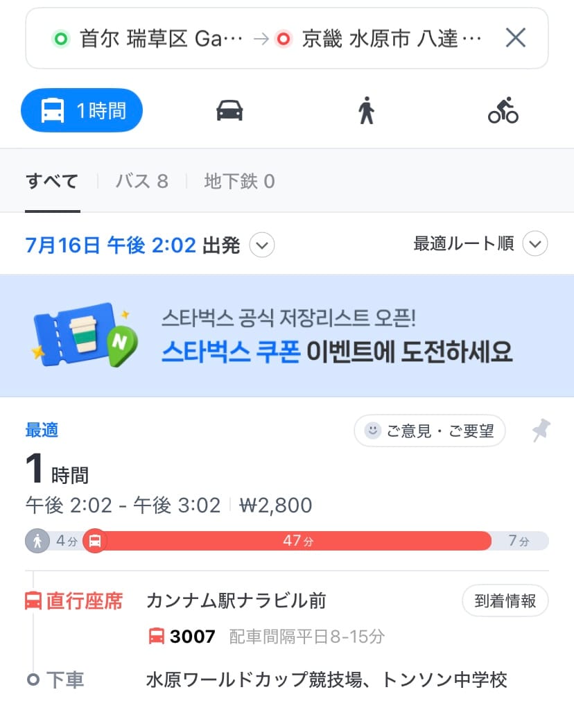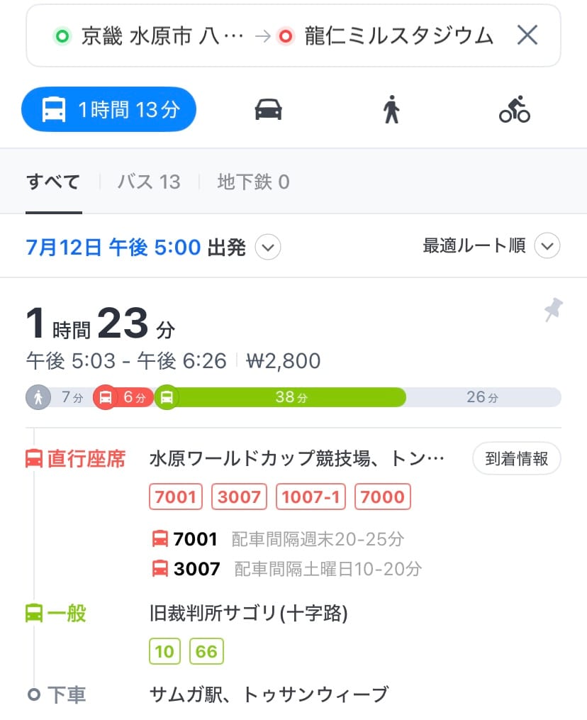 アクセスを調べる方法は同様で、「수원월드컵경기장」と入力して検索すればOKです。