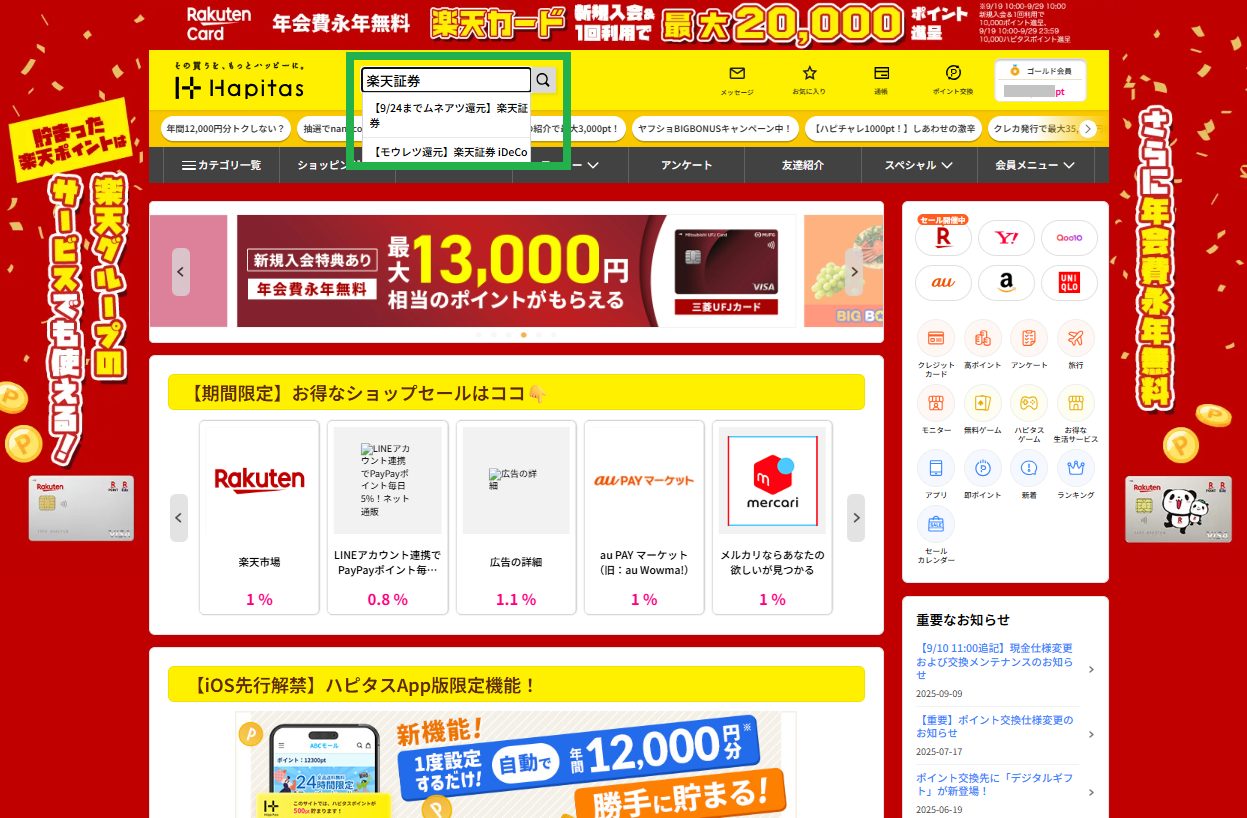 手順2 ハピタスにログインし、トップページで「楽天証券」と検索(パソコン版を例にガイドしますがスマホ版でも要領は同じです。)