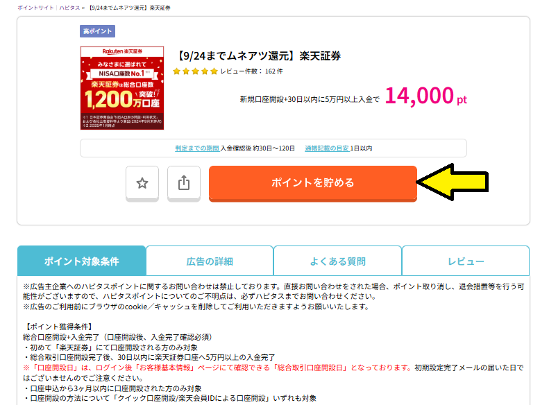 9/30までに↑のバナー経由でハピタスに新規登録し、楽天証券を含めハピタスに掲載されているポイント広告を利用し 10/31までに合計1,000ポイント以上獲得すればOK。