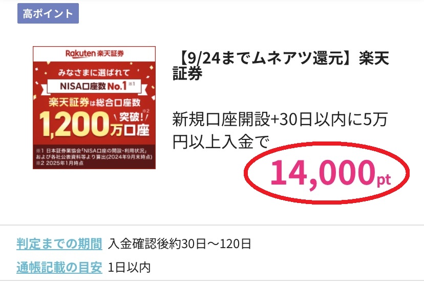 新規口座開設をして、30日以内に証券口座へ5万円を入金するだけで リスクなく14,000円~16,000円分のポイントを獲得できる賢い申し込み方法を実際の画像ともにご紹介します^-^