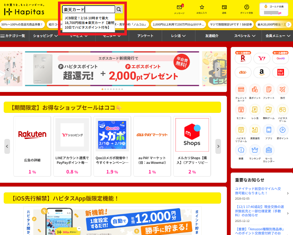 手順2 ハピタスにログインし、トップページで「楽天カード」と検索