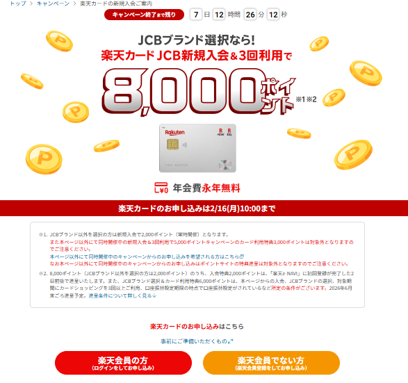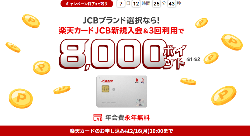 年会費無料のカード発行で合計20,700〜22,700円相当の特典を獲得できるこの絶好機は定員に達して早期終了する可能性が十分ありますので、期間は2月16日(月) 午前9:59までですが ぜひお早めにチャンスを掴んでくださいね!