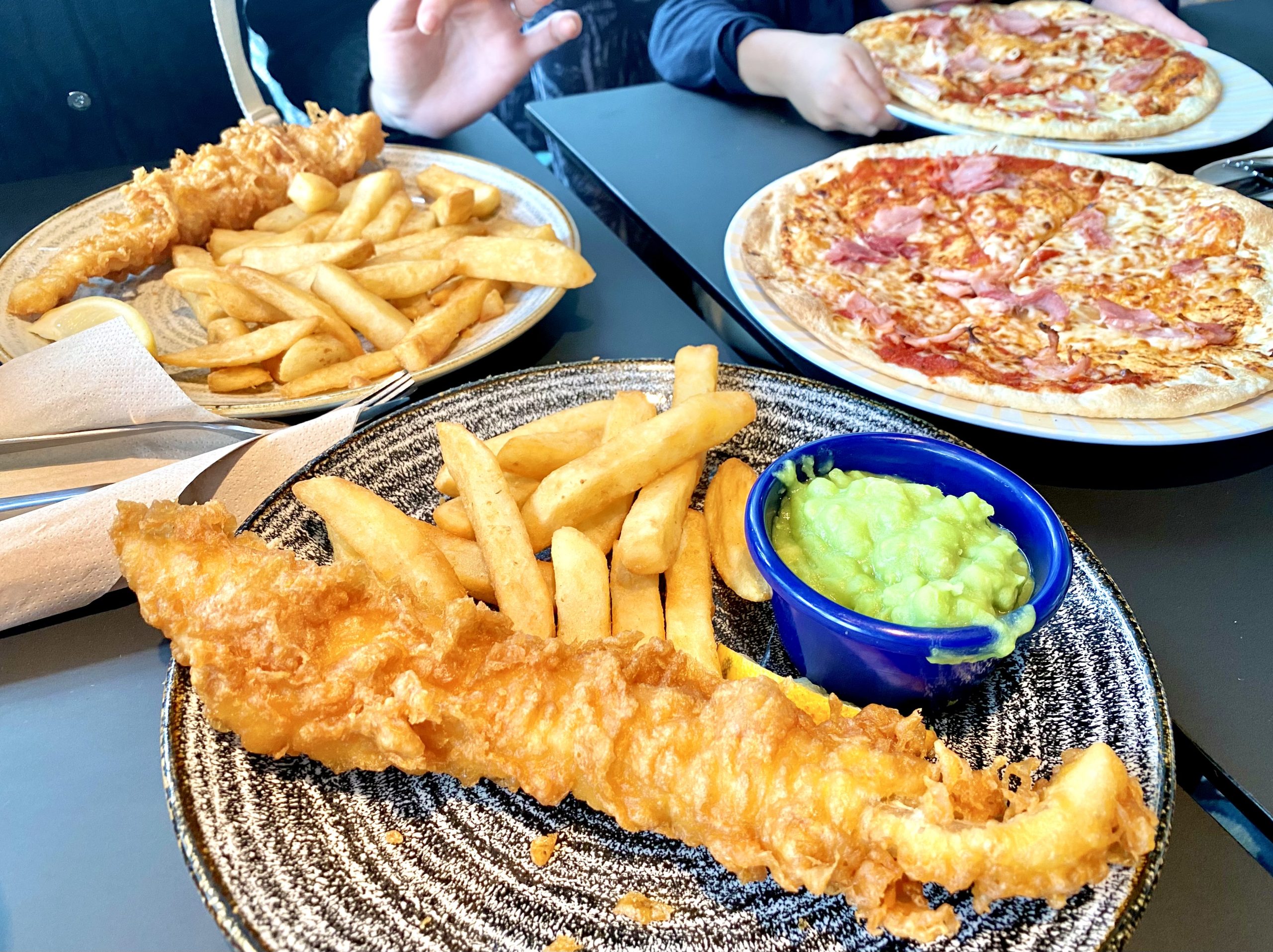 注文してから10分くらい経った頃にこどもたちのピザが、そしてさらに3分くらい経過したところで大人のフィッシュ&チップスがやってきました。