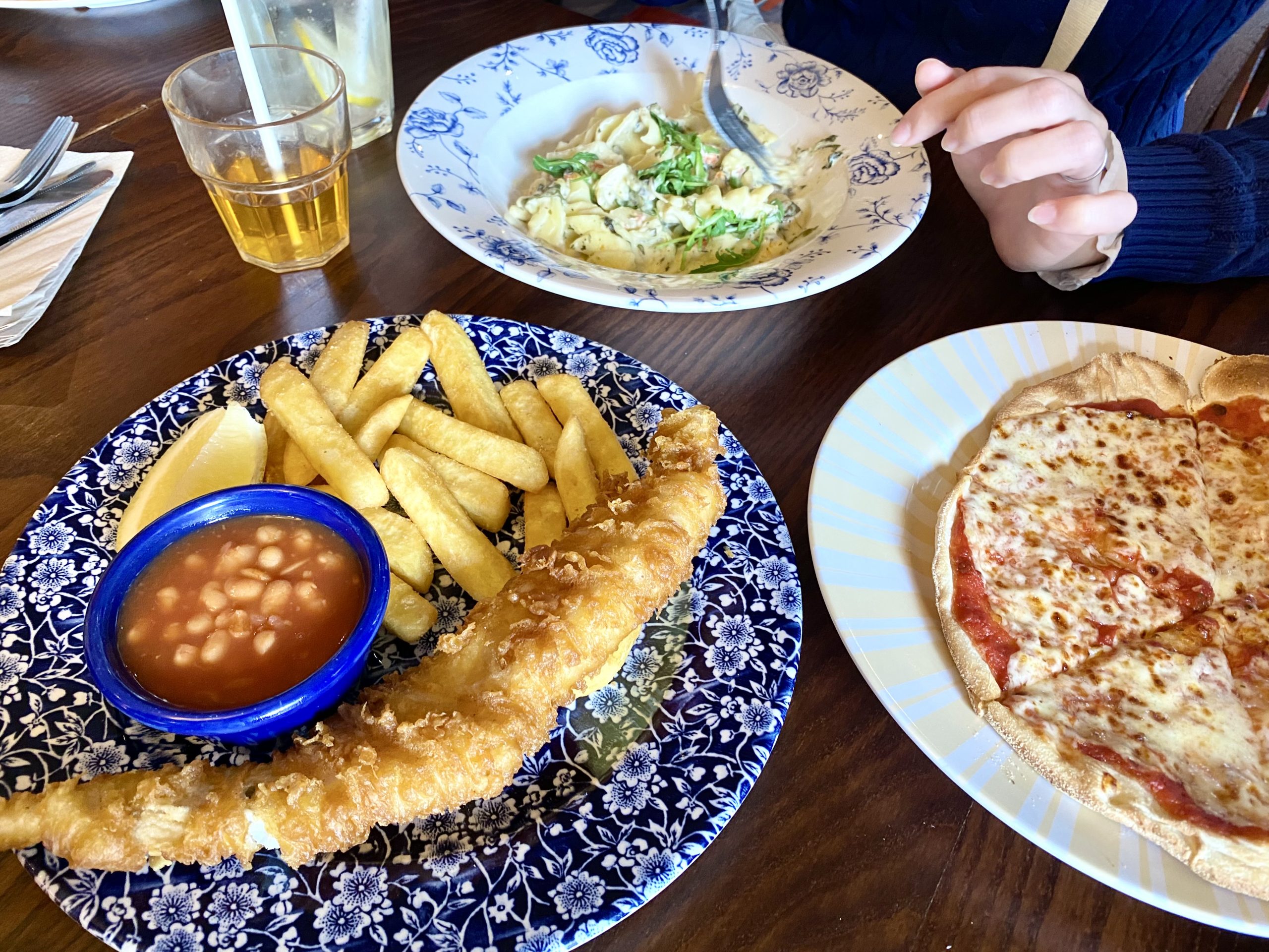 こどもたちはキッズメニューのパスタとピザ、嫁氏はパスタ、私はまたフィッシュ&チップス(笑)。