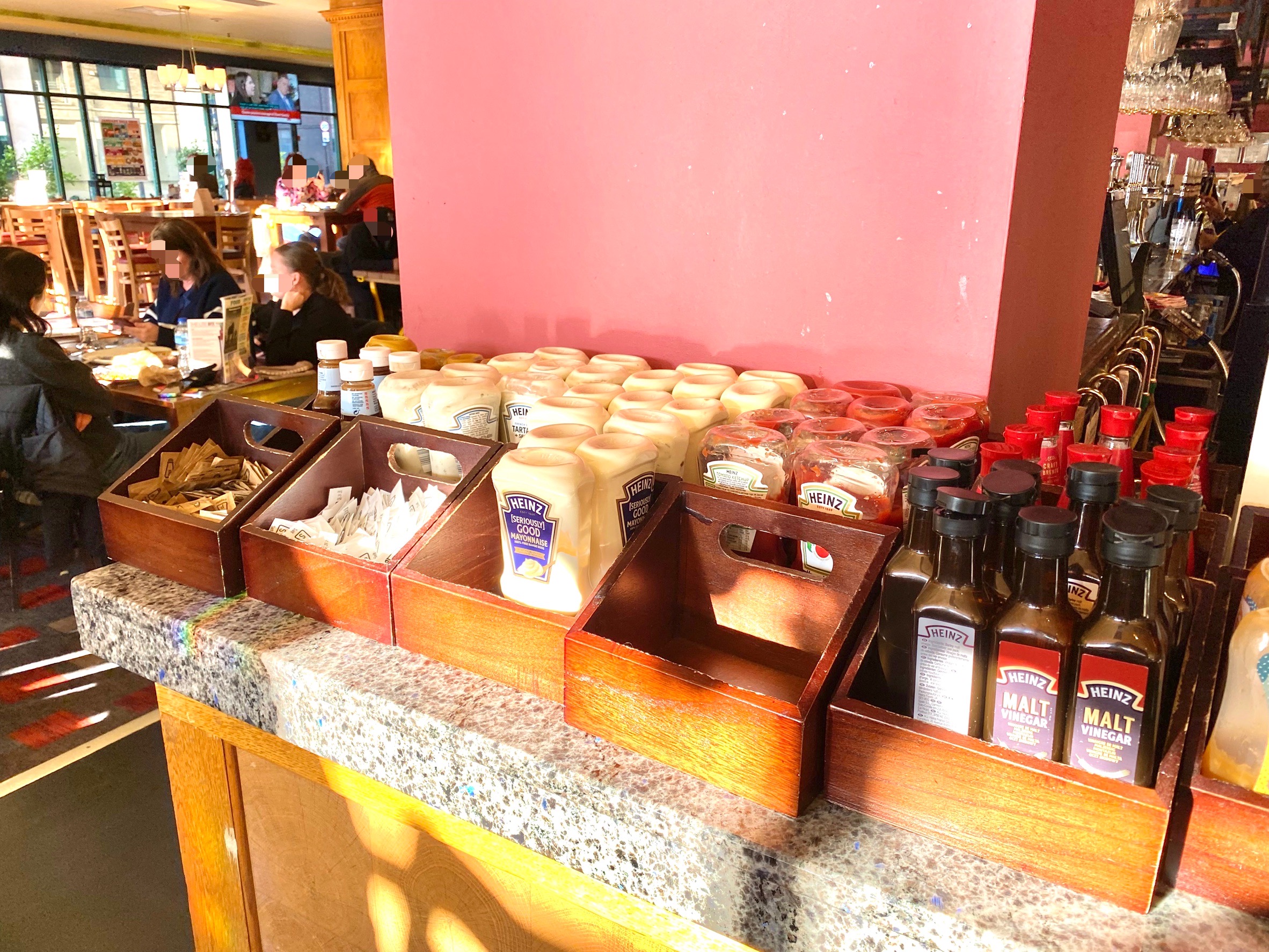 このお店も、ケチャップやタルタルソースはこんな感じで自由に持っていってよい形式。